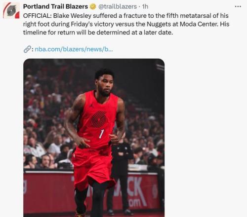 继利拉德(左跟腱撕裂)、亨德森(左腿筋撕裂)和塞布尔(左手拇指尺侧副韧带撕裂)后,韦斯利又遭遇右脚第五跖骨骨折,四人将长期缺席。