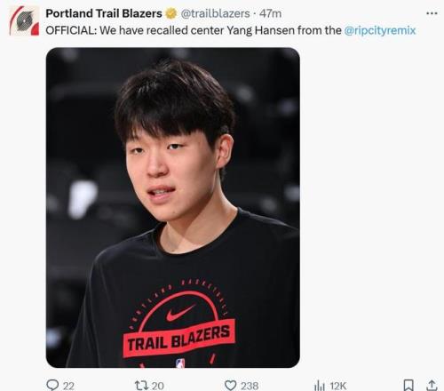 根据开拓者队官方宣布,球队已经将杨瀚森从发展联盟召回,在对阵湖人之前重新回到球队之中。