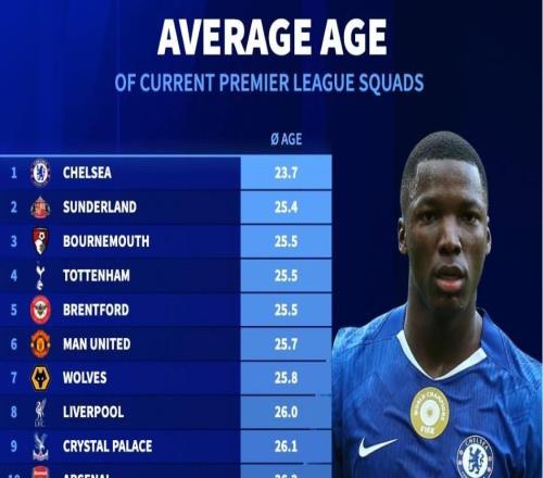 德转统计本赛季英超20队平均年龄:切尔西23.7岁最年轻 -