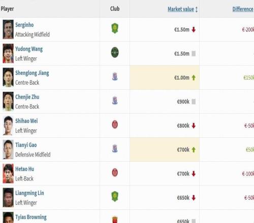 中超国内球员身价前十:塞鸟、王钰栋150万欧居首,韦世豪第五 -